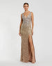 Fully sequined and hand-beaded gown with a plunging v-neckline and low scoop back. Floor length skirt features a high slit and a sweeping train.