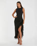 Black Ruched High-Low Sheath Dress with Feather Trim