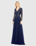 Blue Embellished Illusion V Neck Long Sleeve Gown