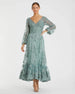 A lovely choice for cocktail parties and weddings, this beautiful embroidered dress features a v-neckline, sheer long sleeves, and allover crystals for a glamourous touch.
