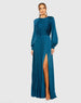 Long sleeve pleated gown with a high neckline, blouson sleeves, pleated bodice, and a thigh-high slit.