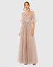 Beige Embellished A Line Gown with Feather Detail Cape