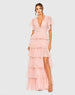 Crafted from chiffon, this elegant gown features a fully lined bodice and skirt, with sheer unlined sleeves for added allure. The flattering V-neck and short flutter sleeves add a touch of femininity, while the concealed back zipper ensures a sleek and seamless look. Perfect for any formal occasion.