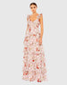 Pink Ruffled Sleeveless Draped Tiered Floral Print Gown