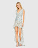 Blue Floral Print Ruched Cap Sleeve High Low Gown