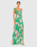 Green Floral Print Ruffled Wrap Over A Line Gown