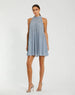 This flirty embellished trapeze mini dress features a high neckline, sleeveless design, and shimmering sequins for added radiance, perfect for any special occasion.