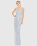Turn heads in this stunning blue dress, crafted from hand-embellished mesh fabric. Featuring a flattering v-neckline, eye-catching floral embellishments, and a column silhouette, this gown is perfect for formal events, and special occasions.