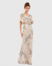 Floor length V-neck gown with dramatic bell sleeves, lace overlay, and floral bead-and-sequin embellishment throughout.