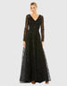 Crafted from embellished fabric, this beautiful v-neck gown features sheer long sleeves, allover heat-set crystals and a flattering a-line silhouette.