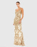 Stunning gown with allover leaf-patterned embellishment, a plunging illusion v-neckline, and an elegant train.