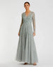 This gorgeous surplice gown is crafted with a sheer mesh overlay adorned with 3D floral embellishments across the bodice, arms, and skirt. With a v-neckline, sheer long sleeves, and a flowing skirt, this dress is an elegant choice for your next event.