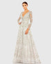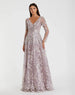 This elegant A-line gown features a hand-embellished embroidered overlay. With a partially lined bodice and fully lined skirt, the sheer unlined sleeves add a touch of romance. The V-neck and faux wrap bodice provide a flattering silhouette, while the all over heat-set jeweled embellishments add a touch of glamour. Perfect for a special occasion, this gown is sure to make you feel confident and stylish.