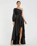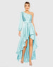 One-shoulder full-length satin dress with a single long sleeve, pleated bodice, and a pleated skirt with a hi-low hemline.
