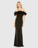 Chic off-the-shoulder crepe gown, featuring a flattering sleeveless design. The ruffle frill detailed neckline adds a touch of elegance, while the back vent ensures comfort and ease of movement. Perfect for cocktail parties, evening events, or special occasions, this dress combines sophistication with a modern twist.