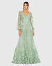 Elevate your special occasion wear with this gown. Featuring a V-neckline, long puff sleeves, and a stunning hand-beaded neckline, it exudes timeless elegance. Adorned with allover heat-set jewel encrusted embellishments, it's perfect for unforgettable moments.