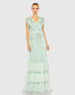 Adorned with allover floral embellishments, this gown features a v-neckline, short flutter sleeves, and a playful ruffle skirt.