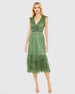 Embellished dress with v-neckline, ruffled cap sleeves, and intricate beaded waist detailing.