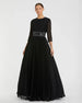 This sparkling structured ballgown features a pleated bodice and a flattering A-line skirt. The semi-sheer 3/4 sleeves hit mid-forearm, while a dramatic embellished waistband defines the waist, adding a touch of glamour. Perfect for formal events, galas, or special occasions.